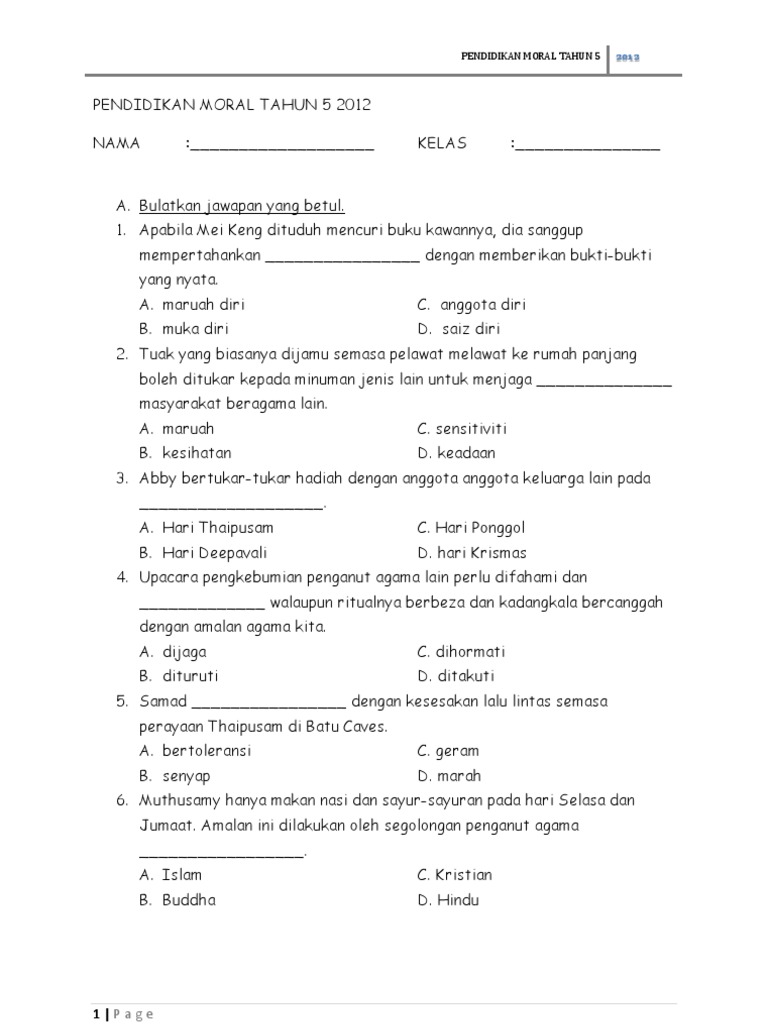 Tahun 5 pendidikan moral set latihan. Koleksi soalan peperiksaan, nota, latihan, jawapan … To explore the effectiveness of moral education in korea and malaysia as a contribution towards teaching humans to be moral in a multicultural parish, steven m. Nyatakan hasrat penyajak berdasarkan sajak tersebut. Ujian bulanan pj tahun 2 2015 / kertas soalan pendidikan moral tahun 5 kssr via www.slideshare.net. Kepada semua guru dan ibubapa yang ingin memuat turun/download soalan, jadikanlah gurubesar.my sebagai hub pencarian soalan peperiksaan terbaik anda. Tajwid tahun 3 отваряне на кутията. Whole numbers / nombor bulat. Senin, 17 mei 2021 tambah komentar edit. Ceramah di sjkt kg simee by sue_hairi73 1058 views. Hormat & taat kepada anggota keluargaarahan: Latihan pendidikan moral tahun 5. Spm atau sijil pelajaran malaysia merupakan satu peperiksaan awam yang sangat penting kepada pelajar.