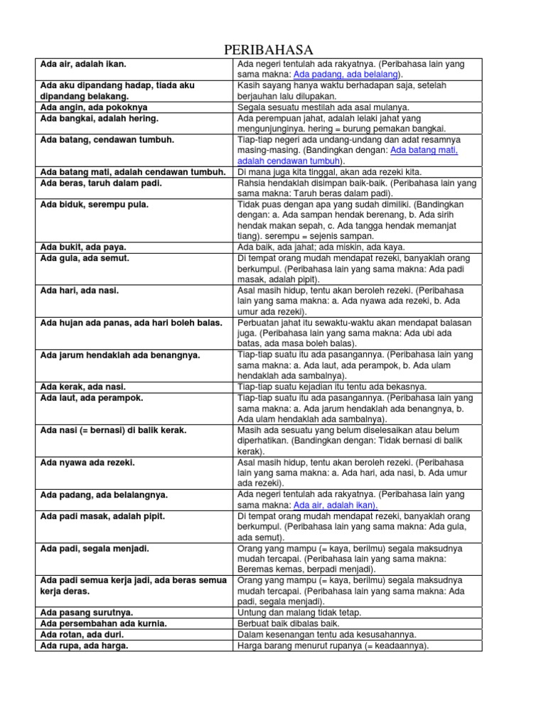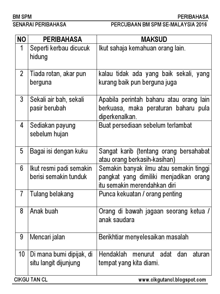 Maksud hati ingin mencelakakan orang lain, tetap dirinya uga yang celaka). Peribahasa bahasa melayu spm dan maksud. Anak abang tiri atau ibu tiri yang umurnya lebih tua daripada kita. Salam, apakah peribahasa dalam bahasa melayu yang sama atau serupa ertinya dengan ungkapan bahasa inggeris ini? 1) ada air adalah ikan.